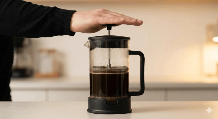 After 4 minutes, press the plunger down slowly and steadily — about 20–30 seconds to reach the bottom. Don't rush it and don't force it.